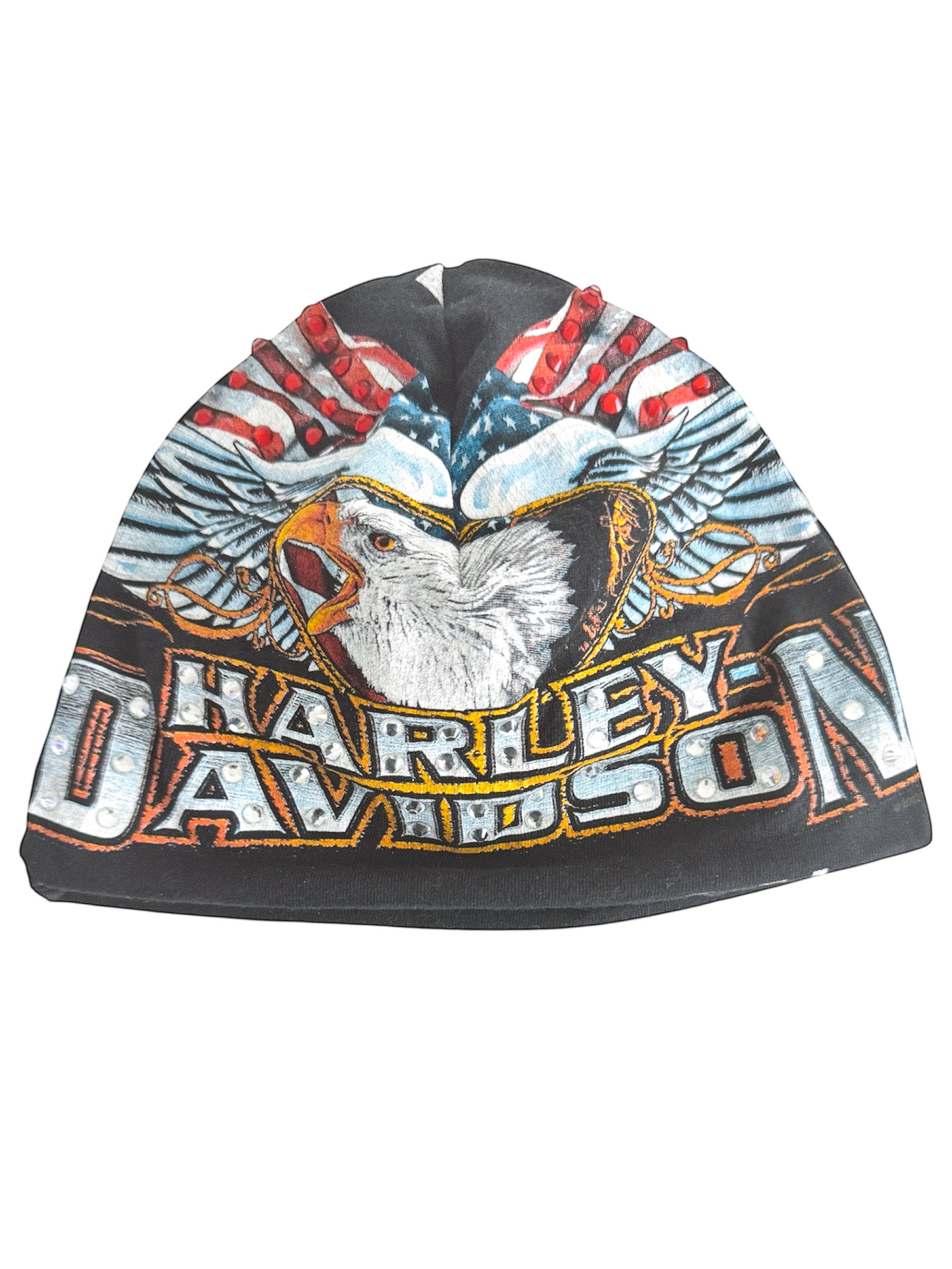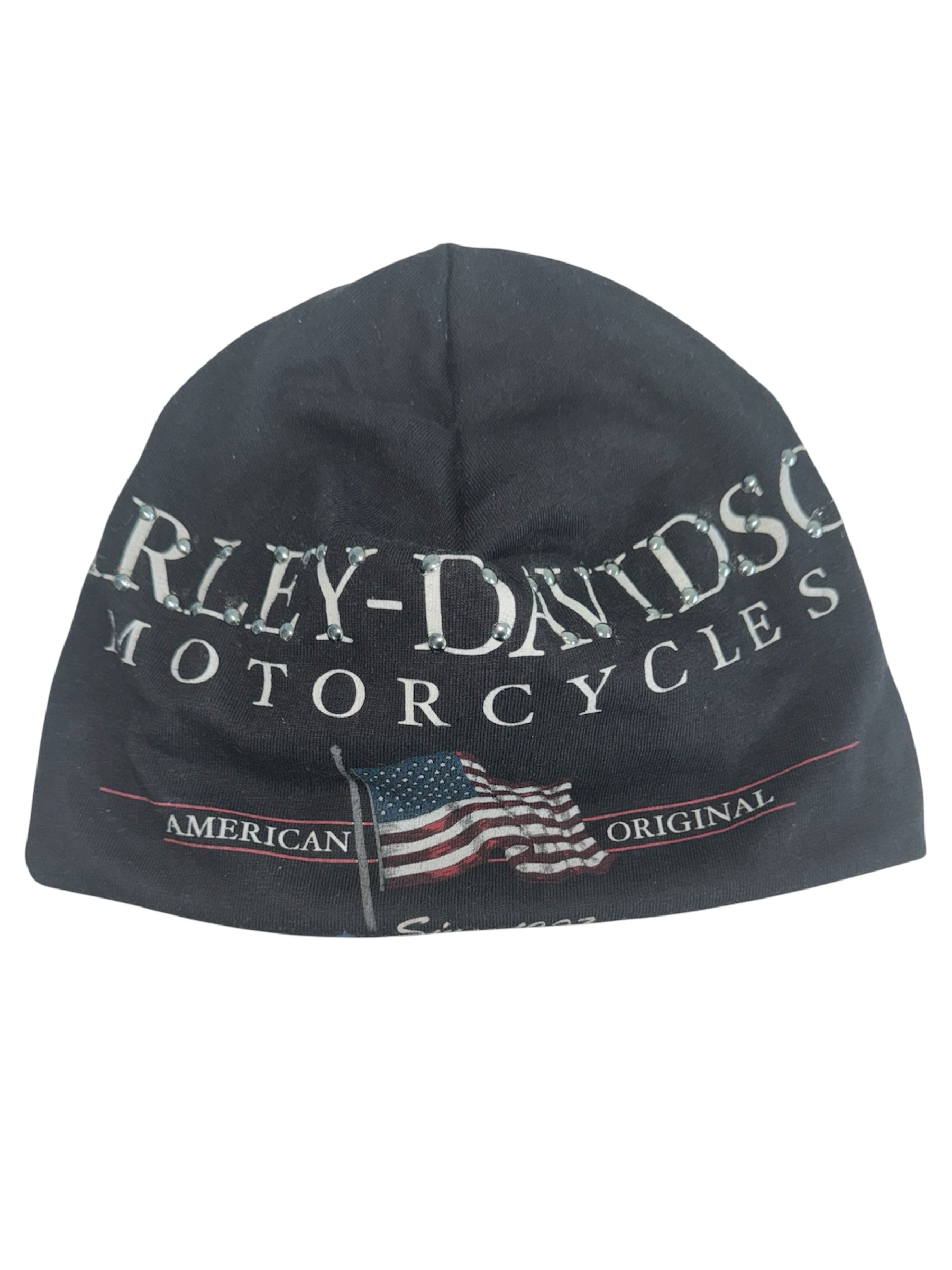 Beanie crafted from a vintage Harley Davidson t-shirt with added embellishments
