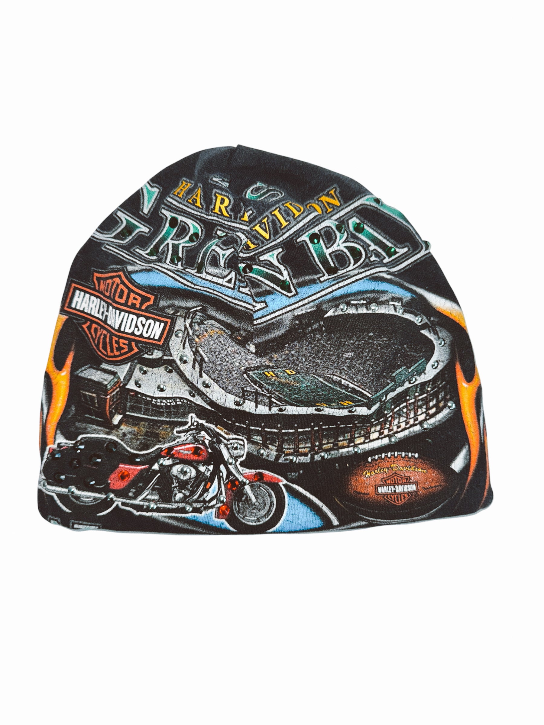 Beanie crafted from a vintage Harley Davidson t-shirt with added embellishments