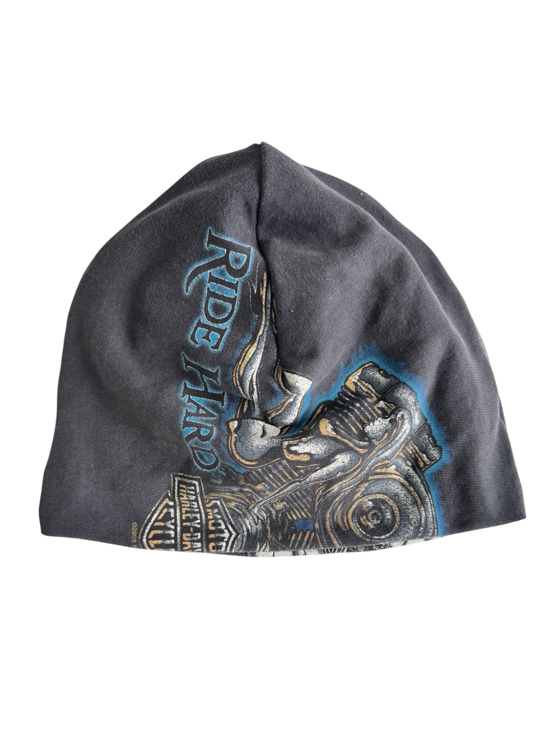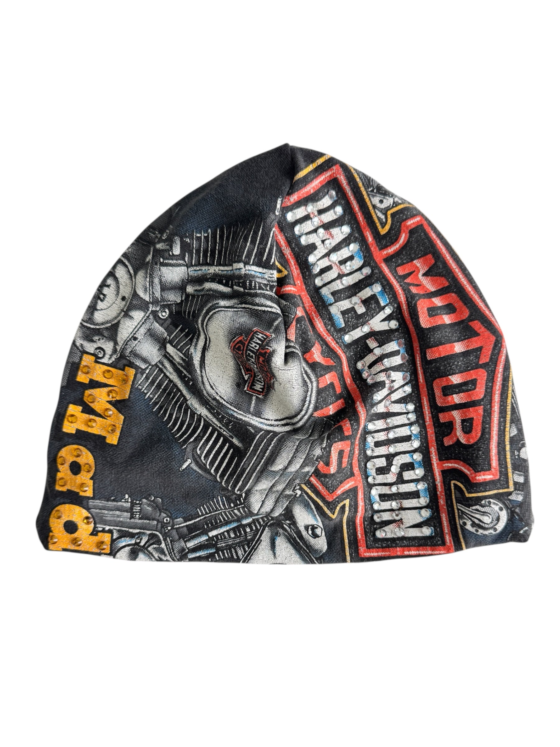 Beanie crafted from a vintage Harley Davidson t-shirt with added embellishments